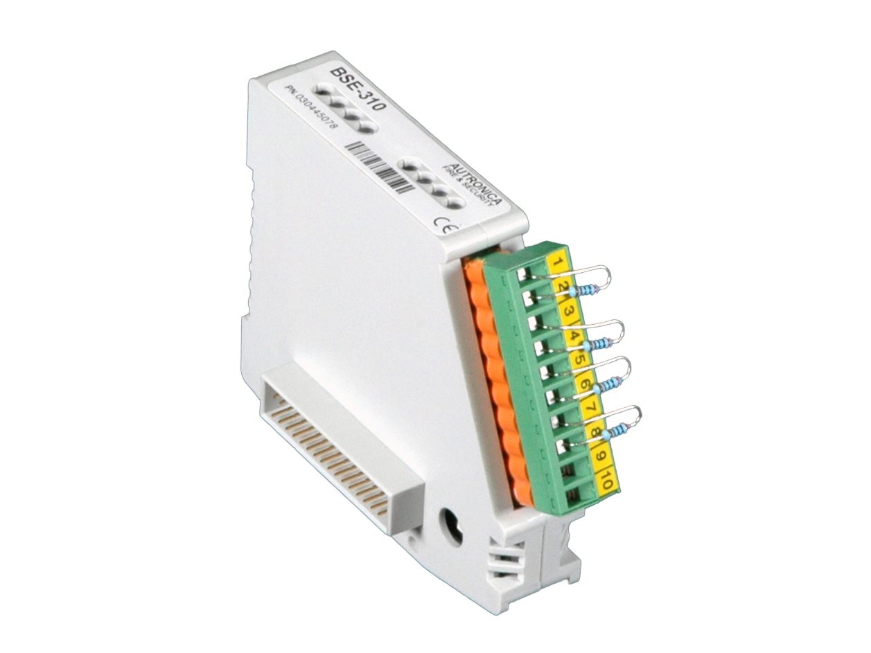 Inngangsmodulen BSE-310 har fire overvåkede innganger for digitale inngangsenheter og andre styreinnganger. Modulen plugges enkelt på en montasjeskinne inne i brannalarmsentralen BS-420 eller kontrolleren BS-420.