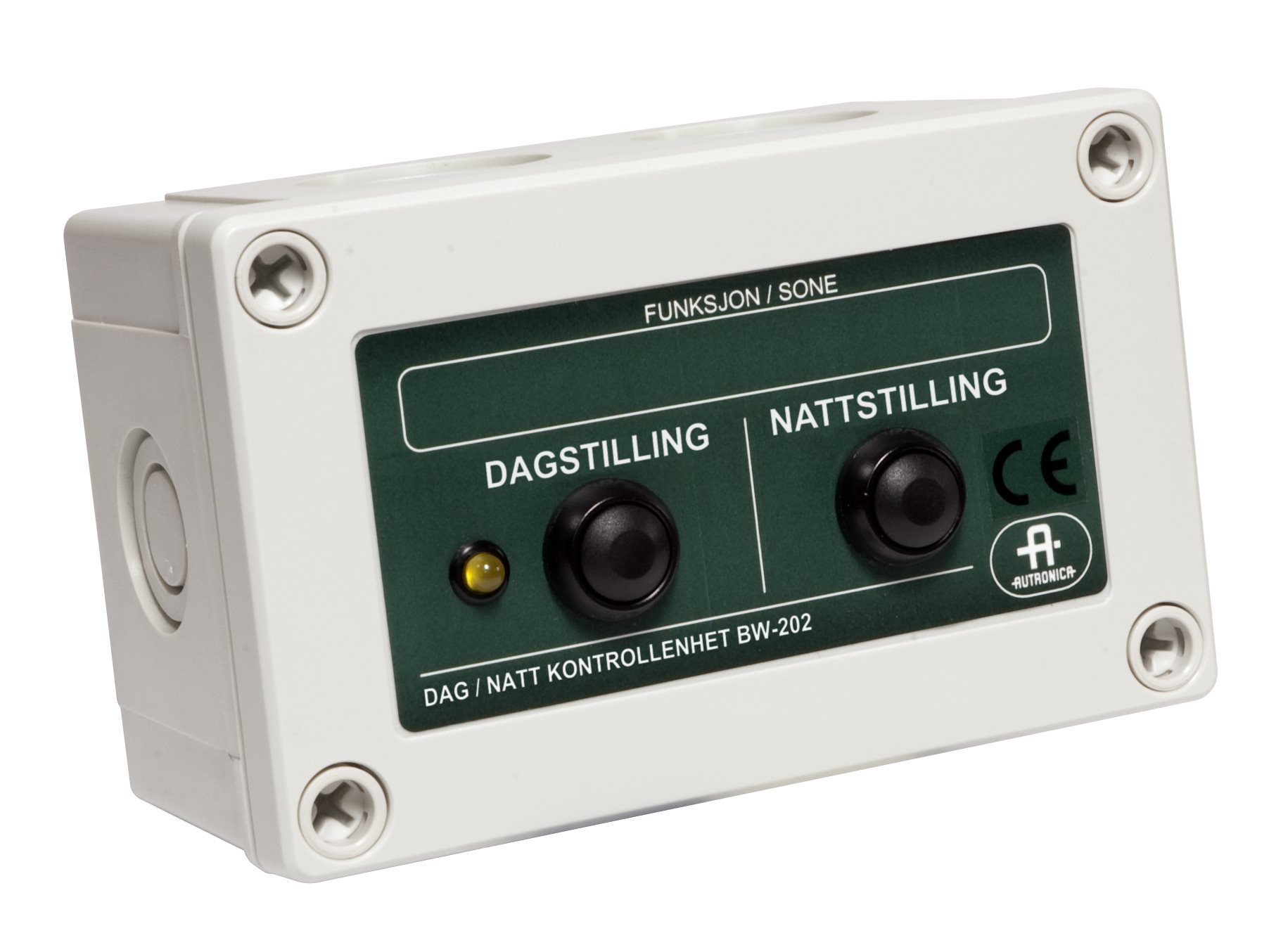 BW-202 er en enhet for ekstern styring av dag-/nattfunksjonen. Enheten kobles på en detektorsløyfe, og man kan manuelt aktivere eller deaktivere forsinket aktivering av alarmsoner, styreutganger og alarmsendere (FARE).