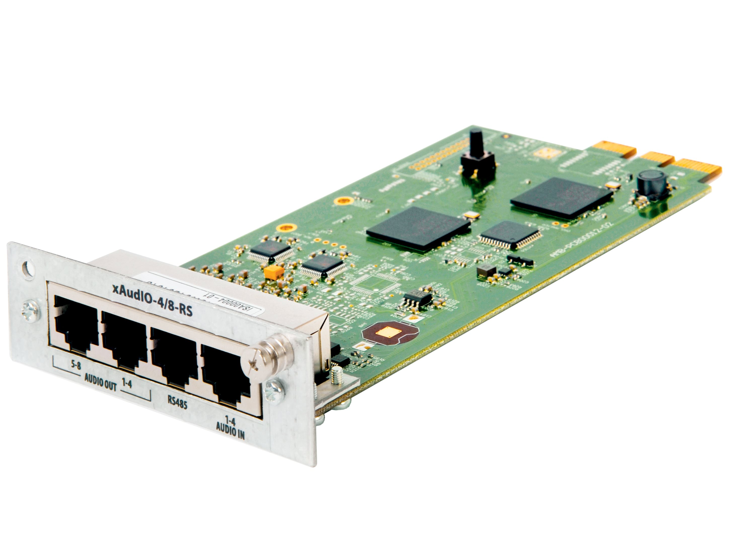 Dette kortet har 4 audioinnganger via en RJ45-kontakt og 8 symmetriske utganger via en RJ45-kobling for å lede ut audiosignaler til de eksterne enhetene eller forsterkerne i MULTIVES-systemet.
